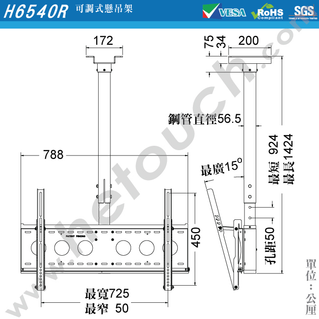 可上下伸縮範圍924~1424公厘,每格間隔距離為50公厘;另外,鋼管直徑為56.5公厘,除可