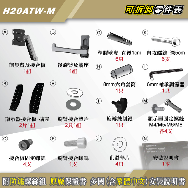 內附的壁掛自攻螺絲、顯示器固定螺絲均經過鍍鎳或防鏽處理,不銹蝕變形。長5公分的自攻螺絲及直徑10公厘的塑膠壁虎,可用於水泥、磚牆等一般牆面,另外自攻螺絲也可單獨使用於木板牆面(實心厚度須大於3公分),HE的螺絲針對以上牆面皆可讓牆座緊貼,並讓顯示器及支架穩固、耐用、抗震!!保護您使用上的安全