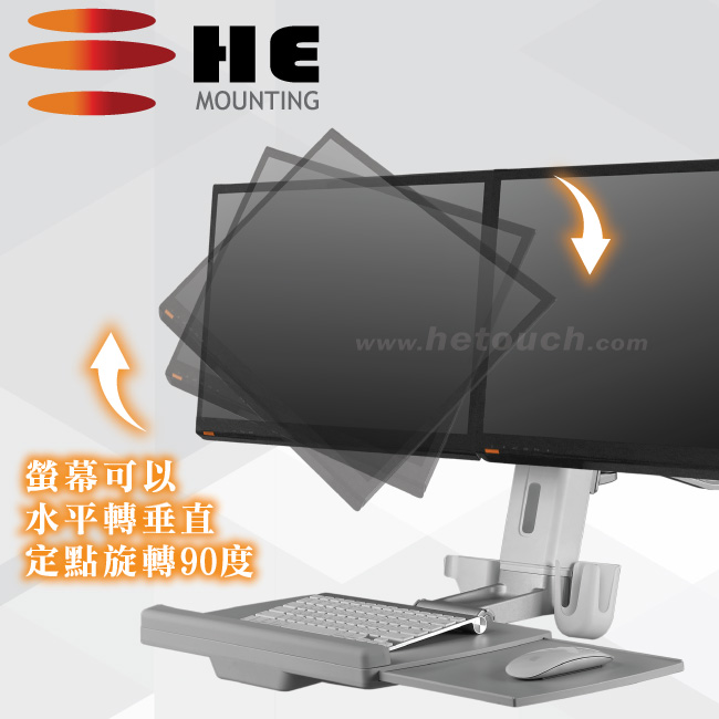 此螢幕鍵盤架可全方位多角度移動,顯示器更可單獨高低升降,藉以調整至舒適的操作位置;旋臂並附有調節軸承,可依據不同的顯示器及週邊設備重量來調整前後拉伸、左右轉向及移動時的流暢度,完全實現人體工學以人為尊的概念。