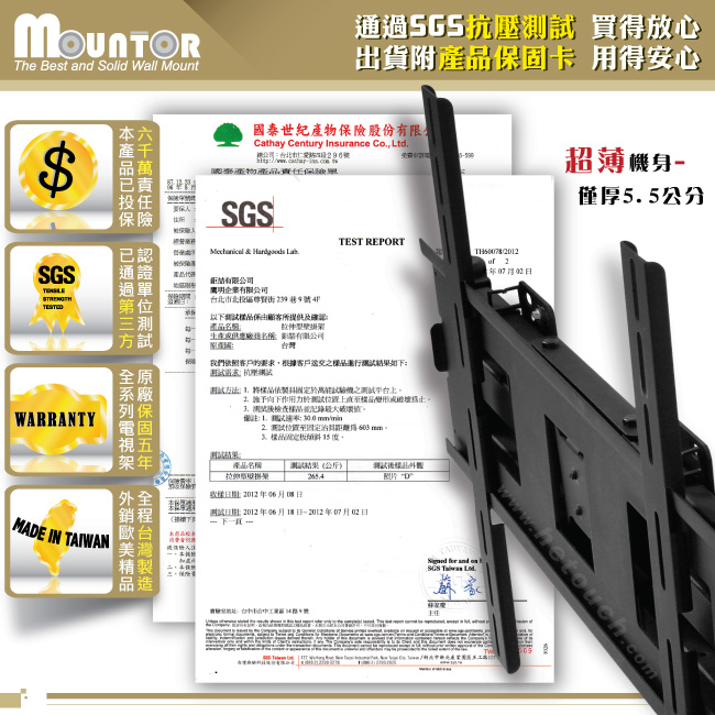 ◤通過SGS檢驗-通過第三方認證單位(SGS)的抗壓測試,支架的承載力至少可達60公斤,牆面固定座更可承載達4倍以上重量,讓顯示器穩固於牆面,歷久不”摔”。