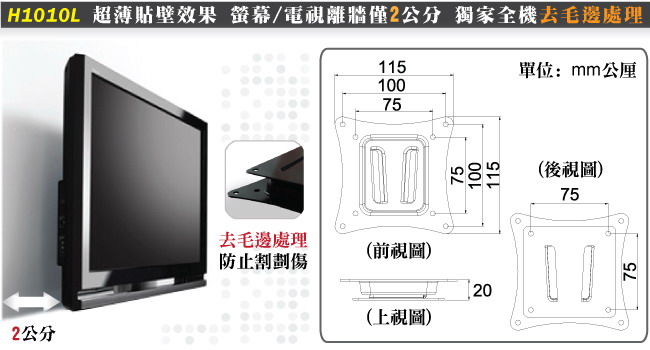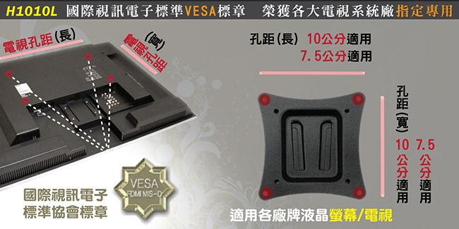 用型壁掛架H1010L,除了真正通過VESA標準外,也適用於孔距長10公分/寬10公分或長7.5公分/寬7.5公分
