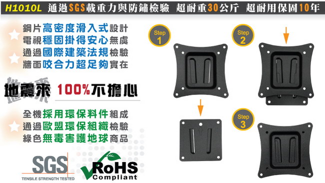 H1010L的電視固定板與牆面固定板採用中鋼鋼材製造,搭配高密度滑入式設計,結合後絕不