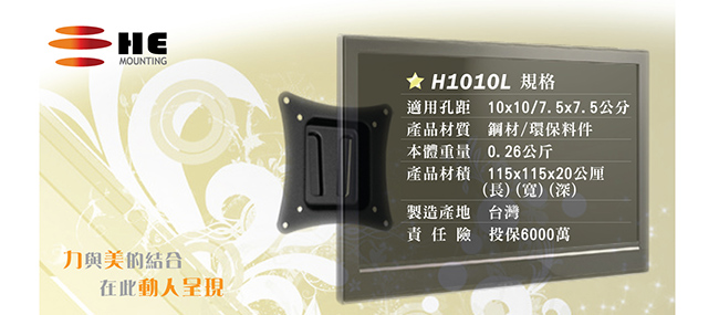 斤,本體絕對不會變形,而機身採用防鏽烤漆,所以HE的產品能提供給消費者10年的保固期,保證壁掛