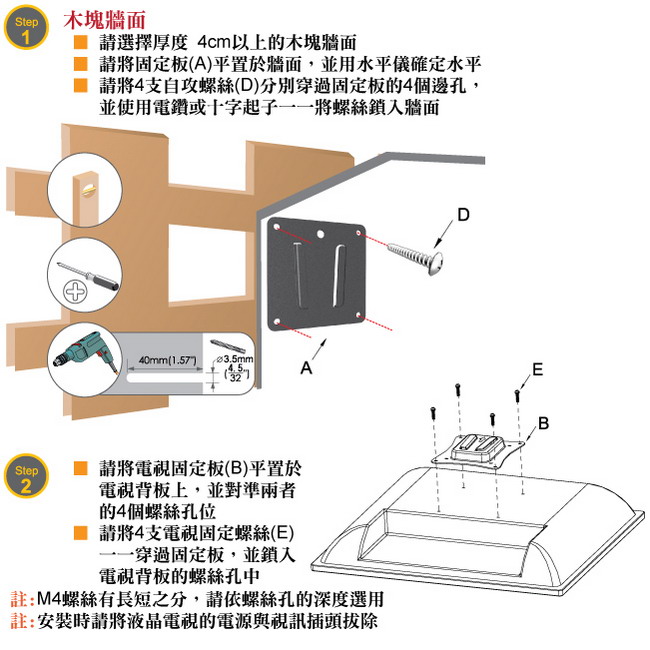 牆面,另外自攻螺絲也可單獨使用於木塊牆面,無論何種牆面皆可讓背板緊貼,永不鬆脫,保護您與府