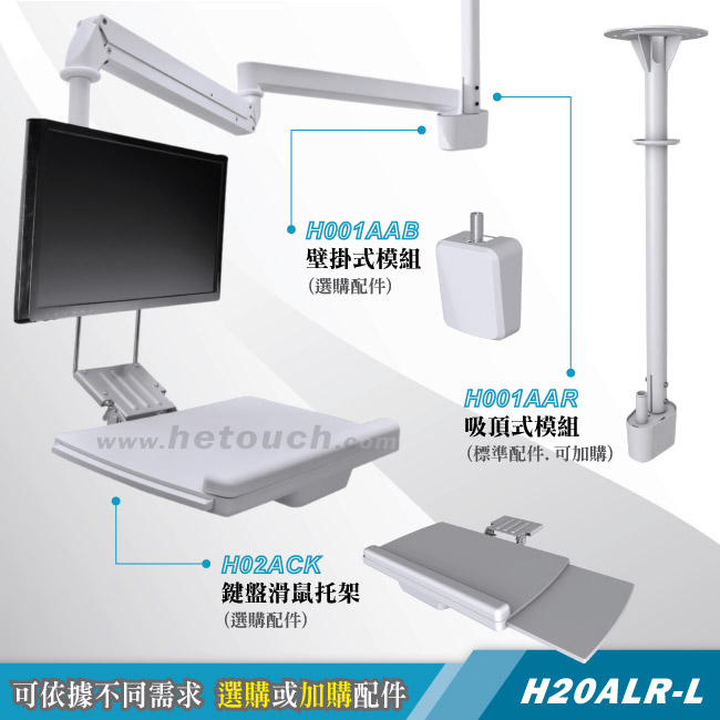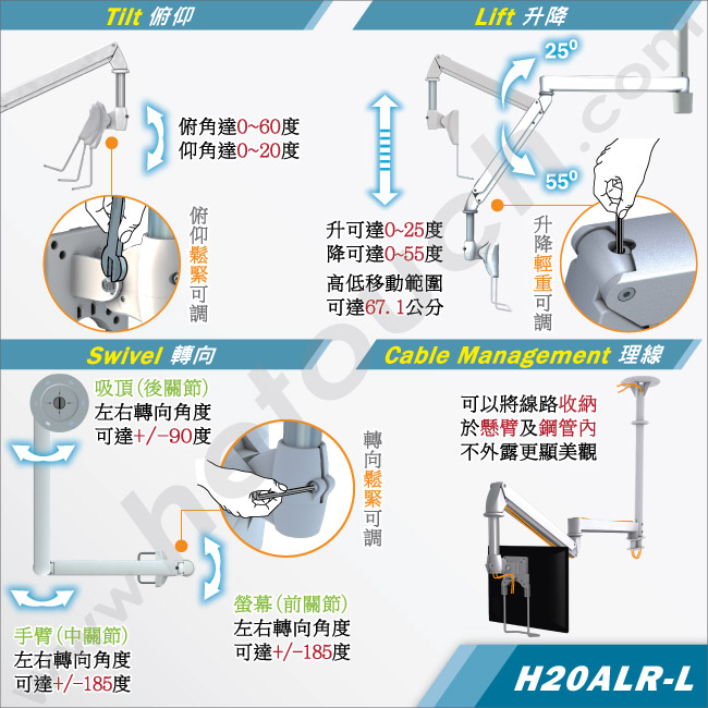 ●適用24吋以下支援VESA孔位的顯示器 ●顯示器重量須超過6公斤並低於12公斤 ●可隨意升降.前後左右移動.俯仰角度調整 ●讓病患.家屬.護理人員.臨床醫師交互使用 ●無論站著.坐著.躺著皆可舒適觀看及操作 ●三向調節閥-控制移動顯示器時的流暢度 ●懸臂保險栓-防止懸臂與顯示器意外碰撞 ●鋼管的垂直伸縮範圍為110~170公分 ●懸臂及吸頂模組可內藏線路完全不外露 ●台灣製造 / 保固3年 / 投保責任險6000萬