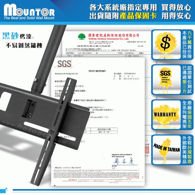 ◤通過SGS檢驗-本產品過第三方認證單位(SGS)的破壞測試,支架的承載重力可達75公斤,讓您的電視穩固於牆面,歷久不”摔”。