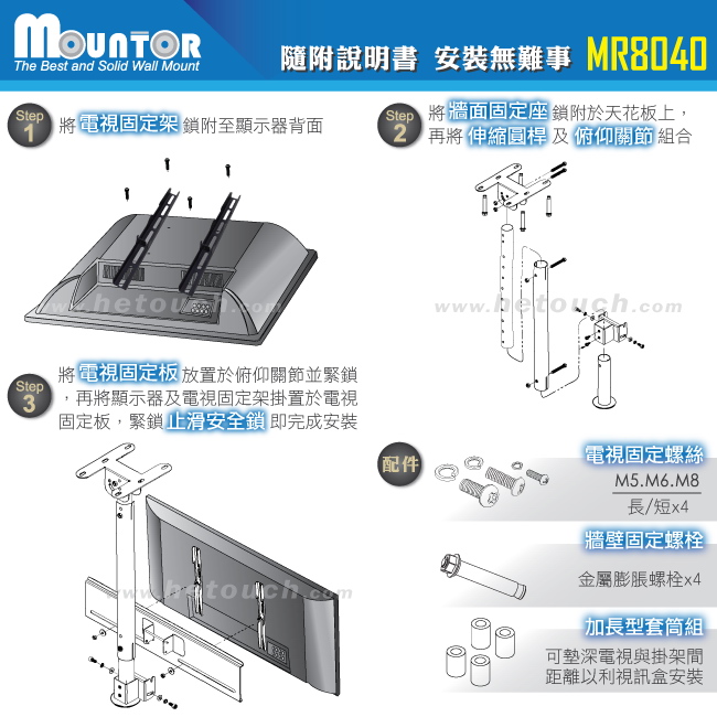 螺絲規格 (顯示器端) M5, M6, M8 (產品內附)