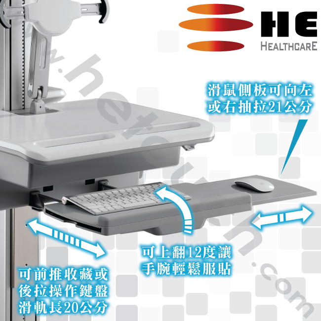 鍵盤滑鼠托架附滑軌(長200mm)可前推收藏或後拉操作鍵盤、滑鼠;並有腕托搭配可上翻12度的功能,讓手腕服貼輕鬆操作;可選擇向左或向右單一方向抽拉滑鼠側板,並可隨意伸縮至合適的寬度(8~217mm),貼心的設計讓慣用左手或右手的使用者皆可無障礙操作。