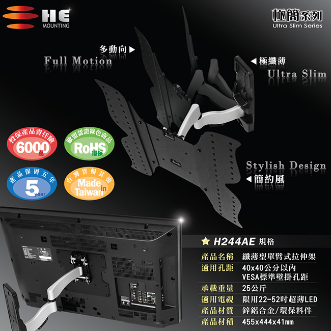 電視,不堪一摔! 所以HE堅持以消費者的安全性為優先考量,推薦您這一款H244AE壁掛架!