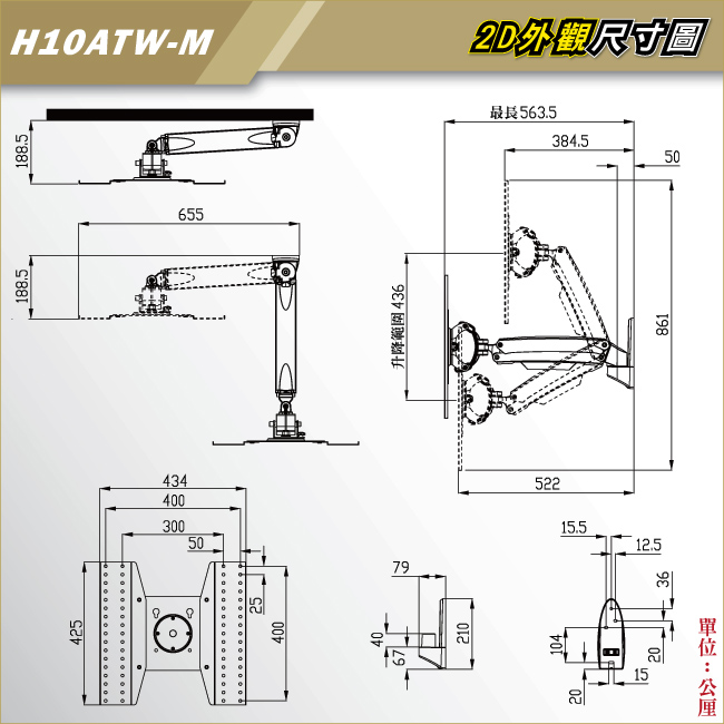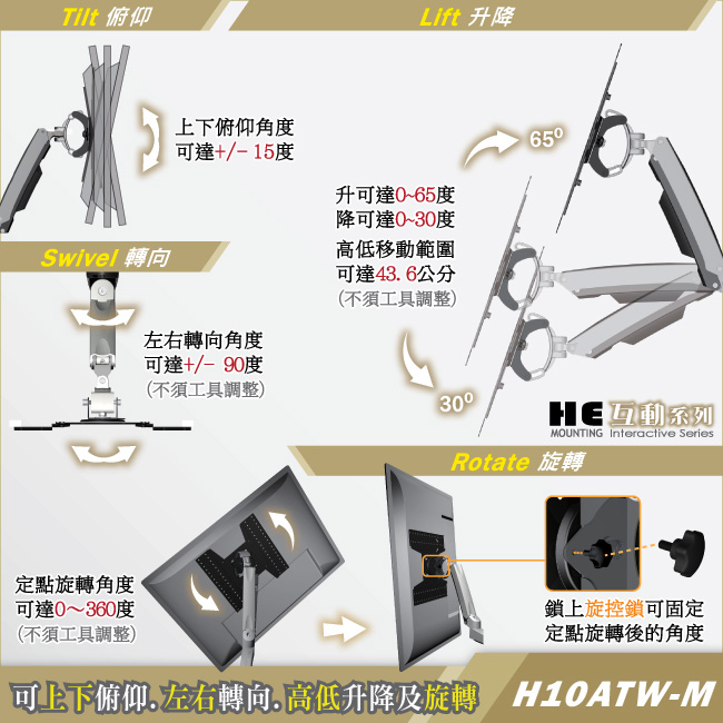 載重10~20Kg單旋臂互動式壁掛架 - H10ATW-M