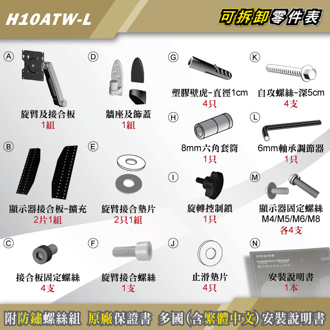 內附的壁掛自攻螺絲、顯示器固定螺絲均經過鍍鎳或防鏽處理,不銹蝕變形。長5公分的自攻螺絲及直徑10公厘的塑膠壁虎,可用於水泥、磚牆等一般牆面,另外自攻螺絲也可單獨使用於木板牆面(實心厚度須大於3公分),HE的螺絲針對以上牆面皆可讓牆座緊貼,並讓顯示器及支架穩固、耐用、抗震!!保護您使用上的安全