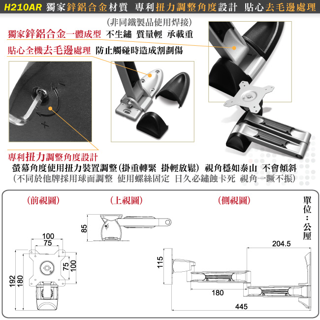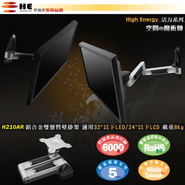 HE H210AR 液晶電視/螢幕鋁合金雙旋臂壁掛架