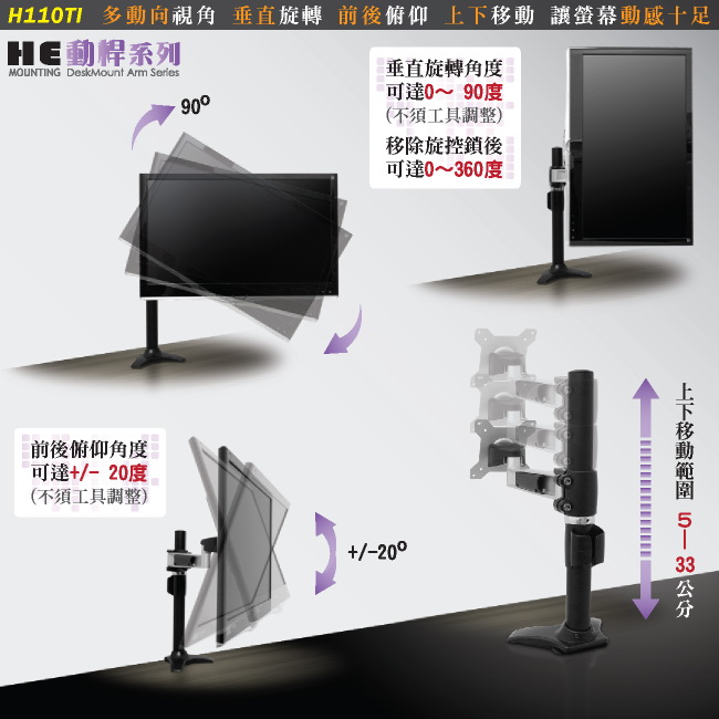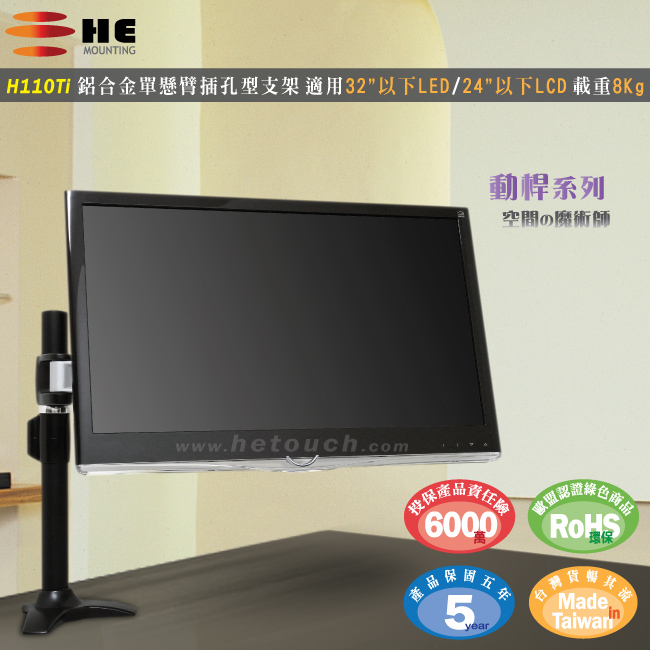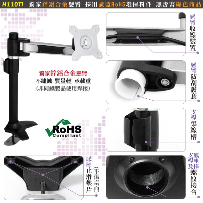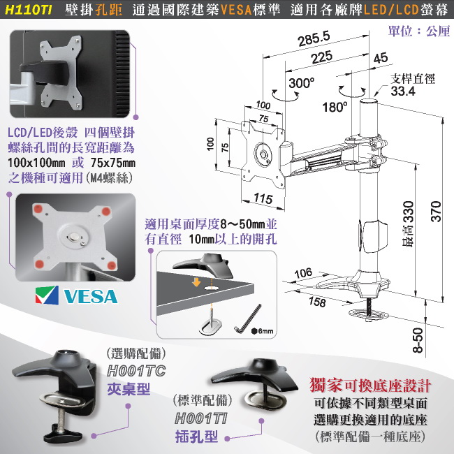 推出通用型懸臂支架H110TI,除了真正通過VESA標準外,也適用於孔距長10公分/寬10公分或長7.5