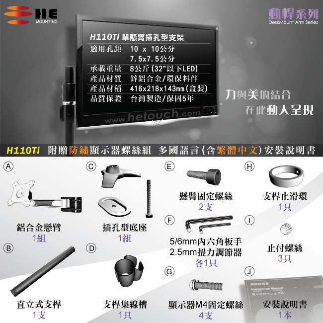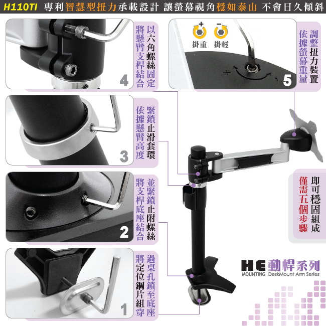 變形,而懸臂採用鋅鋁合金及防鏽烤漆,所以HE的產品能提供給消費者5年的保固期,保證支架在正確的