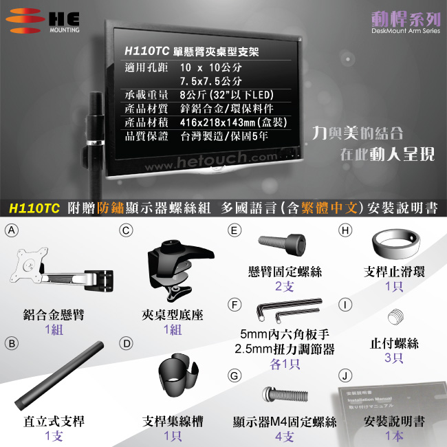 變形,而懸臂採用鋅鋁合金及防鏽烤漆,所以HE的產品能提供給消費者5年的保固期,保證支架在正確的
