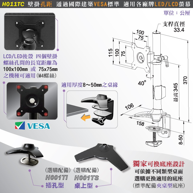 推出通用型多功能支架H011TC,除了真正通過VESA標準外,也適用於孔距長10公分/寬10公分或長7.5