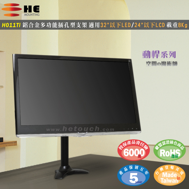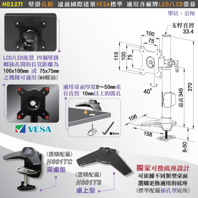 推出通用型多功能支架H011TI,除了真正通過VESA標準外,也適用於孔距長10公分/寬10公分或長7.5