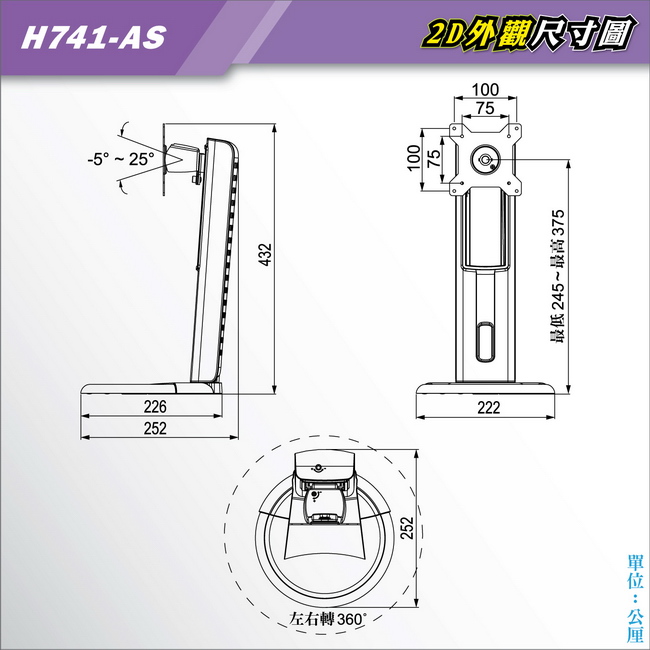 底盤由上中下三層組成,上層為塑型外殼、中層為載重鋼板、下層為旋轉轉盤,讓底盤在不移動的狀態下可輕鬆360度自轉,藉此讓螢幕可達到隨意左右轉向的效果。