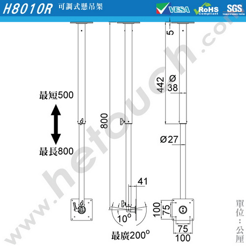調式懸掛架,除了真正通過VESA標準外,也適用於孔距長10公分/寬10公分或長7.5公分/寬7.5公分的顯