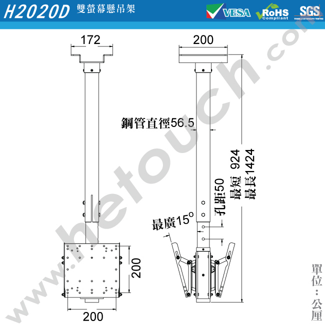 調式懸掛架,除了真正通過VESA標準外,也適用於孔距長20公分/寬20公分、長20公分/寬10公分