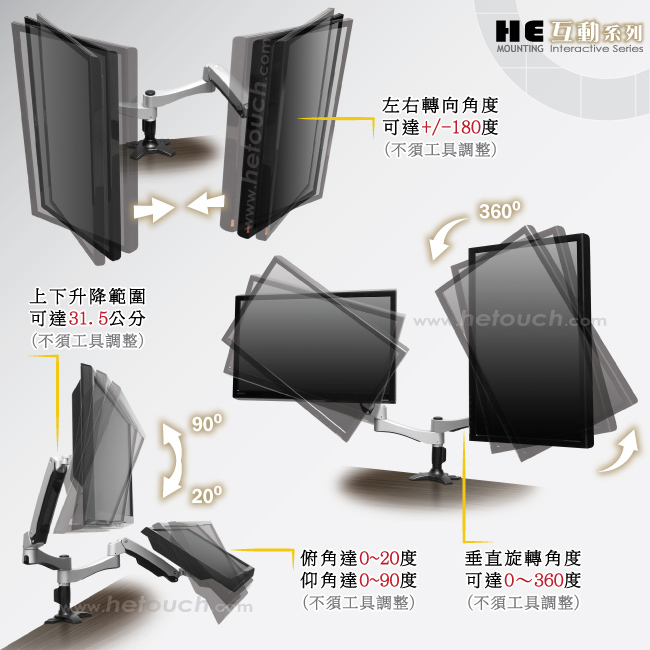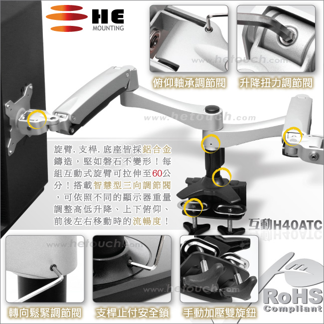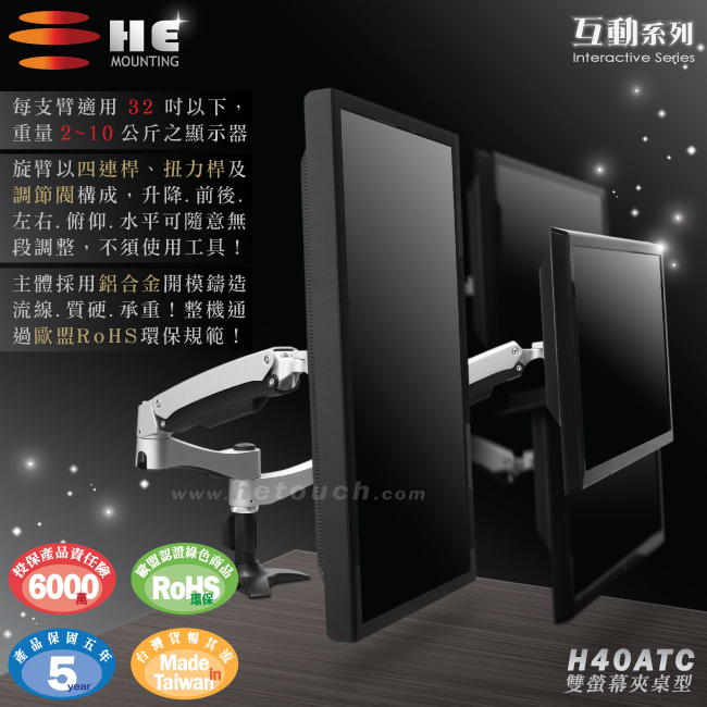 非採用氣壓或油壓棒控制升降,沒有洩氣及漏油等問題,所以裝置新一代扭力桿的旋臂,每支臂可耐重2公斤之上10公斤之下的顯示器,不會日久鬆弛、一蹶不振,故HE能提供長達5年的保固期。
