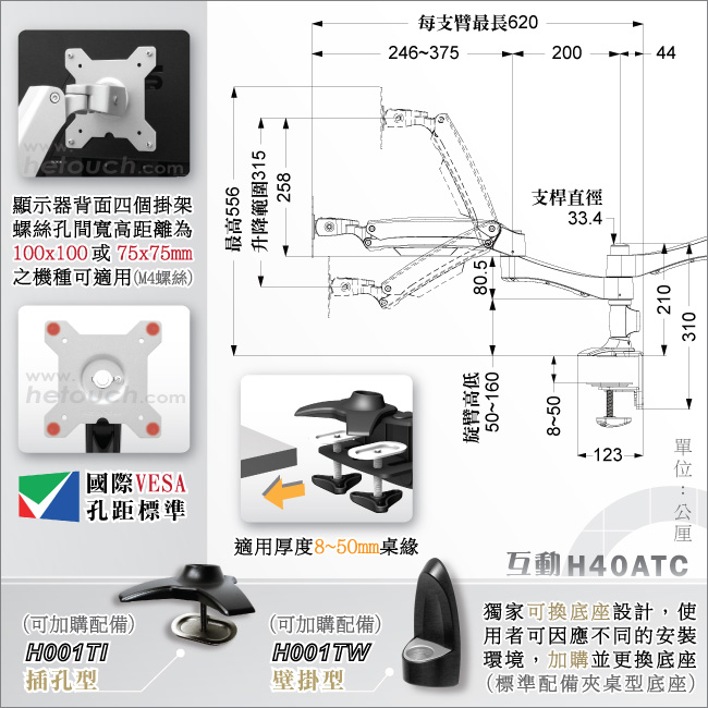 現今各大廠牌的螢幕為跟隨壁掛潮流,皆在螢幕背面預留四個壁掛專用螺絲孔,而孔與孔間的距離,則稱為孔距,由於各家螢幕設計不同,所以孔距的長寬距離都不盡相同,為免此困擾,國際VESA規範訂出多種標準孔距(10x10 / 20x10 / 20x20 / 40x20 / 60x40 / 80x40公分),但各廠商又因為顯示器大小與重量不同而使用不同的標準孔距,甚至有些製造商不跟隨VESA標準,為因應繁多的孔距,HE在此為您推出通用型互動式支架H40ATC,除了真正通過VESA標準外,也適用於孔距長10公分/寬10公分或長7.5公分/寬7.5公分的螢幕,請您在購買本產品前測量顯示器所使用的孔距是否符合以上範圍。