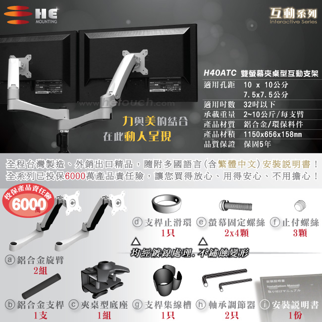 每支臂載重2~10公斤、保固5年、產品責任險6000萬