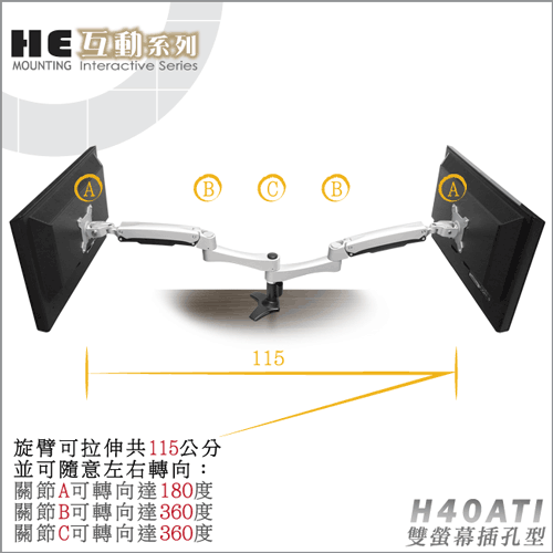 非採用氣壓或油壓棒控制升降,沒有洩氣及漏油等問題,所以裝置新一代扭力桿的旋臂,每支臂可耐重2公斤之上10公斤之下的顯示器,不會日久鬆弛、一蹶不振,故HE能提供長達5年的保固期。