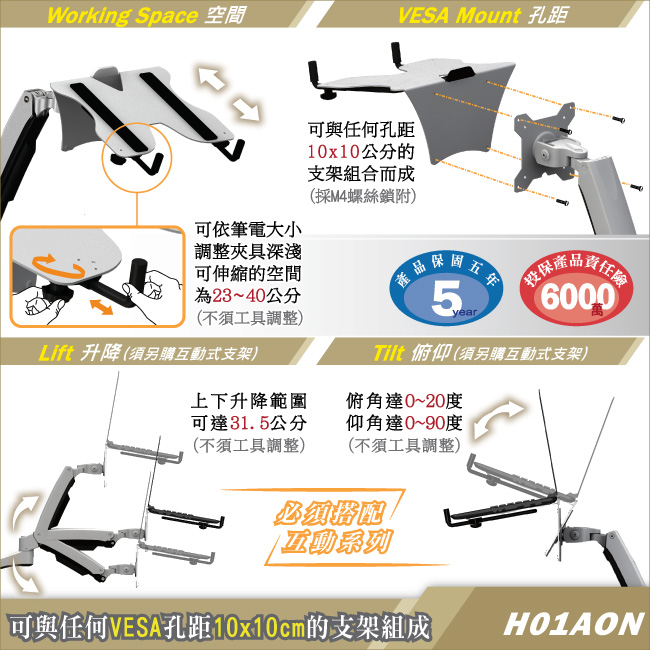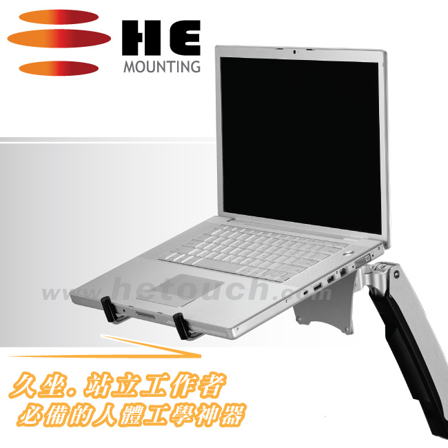 無論您是久坐或長時間站立的工作者,將此配件與HE互動系列螢幕支架(分為壁掛/夾桌/穿桌型-須另購)組成後,可全方位多角度移動,藉此將筆記型電腦架調整至舒適的使用位置,完全實現人體工學以人為尊的概念。