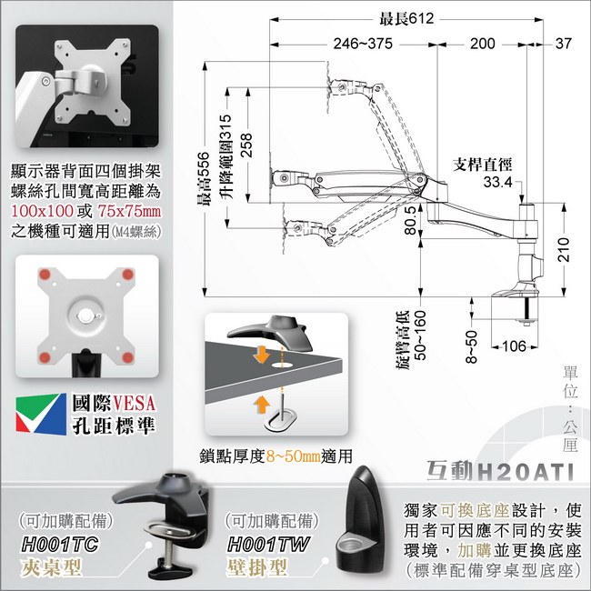 通用型!提供二種VESA孔距(10x10cm / 7.5x7.5cm)