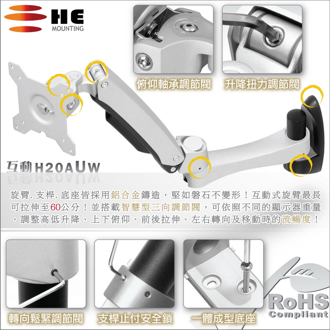 非採用氣壓或油壓棒控制升降,沒有洩氣及漏油等問題,所以裝置新一代扭力桿的旋臂,可耐重4公斤以上12公斤以下的平面液晶顯示器或4公斤以上7.5公斤以下的曲面顯示器,不會日久鬆弛、一蹶不振,故HE能提供長達5年的保固期。