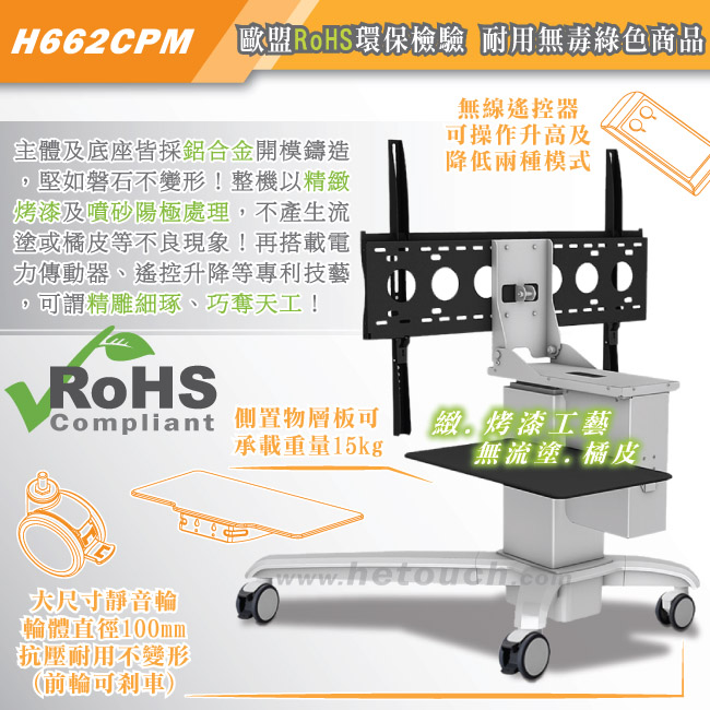 電動柱及底座皆採用鋁合金開模鑄造、一體成型,擁有外型流線、質地堅硬、主體防鏽、質量輕穎等優點;硬度、載重度與防鏽皆經過測試,本體絕對不會變形,保證桌車在正確的使用下能歷久彌新。