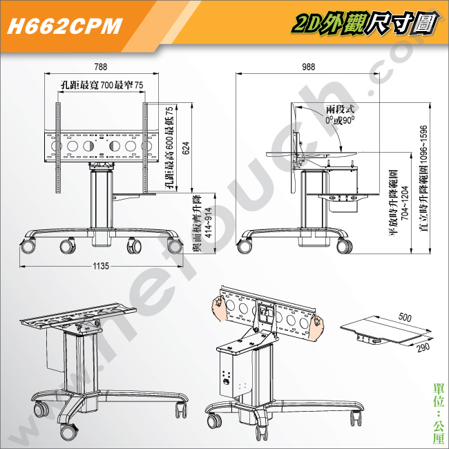 可控制桌車升高及降低,無段式電動升降範圍為50公分。