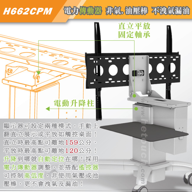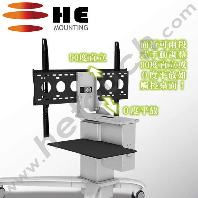 電動升降柱附有直立及平放的軸承,可手動上翻顯示器變形為90度直立或調整變形為0度平放兩種模式,讓使用者可依據不同的操作及展示方式,隨心所欲將桌車變形為觸控桌或觸控推車。