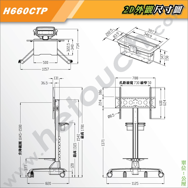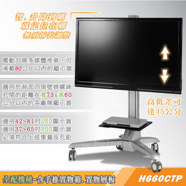 現今各大廠牌的顯示器為跟隨壁掛潮流,皆在顯示器背面預留四個壁掛專用螺絲孔,而孔與孔間的距離,則稱為孔距,由於各家顯示器設計不同,所以孔距的寬高距離都不盡相同,為免此困擾,國際VESA規範訂出多種標準孔距,但各廠商又因為顯示器大小與重量不同而使用不同的標準孔距,甚至有些製造商不跟隨VESA標準,為因應繁多的孔距,HE在此為您推出通用型多媒體推車,除了真正通過VESA標準外,也適用於孔距寬80公分x高60公分以內的顯示器,請您在購買本產品前測量顯示器所使用的孔距是否符合以上範圍或向顯示器廠商詢問。