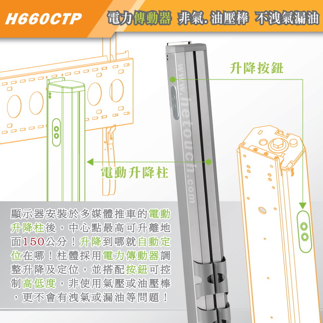 非採用氣壓或油壓棒控制升降,沒有洩氣及漏油等問題,所以裝置新一代電動柱,可耐重80公斤以下的顯示器,不會日久鬆弛、一蹶不振。
