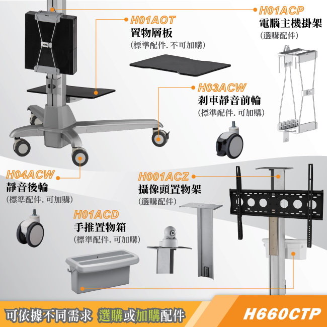 內建手推置物箱,除可放置5公斤以內的物品外,更可藉由推動置物箱的手把輕易控制推車,使其左右轉向或前後移動!置物箱本身亦可上下調整,高低差範圍達55公分;另外,推車也附有固定高度的置物層板,可用來放置15公斤以內的設備。