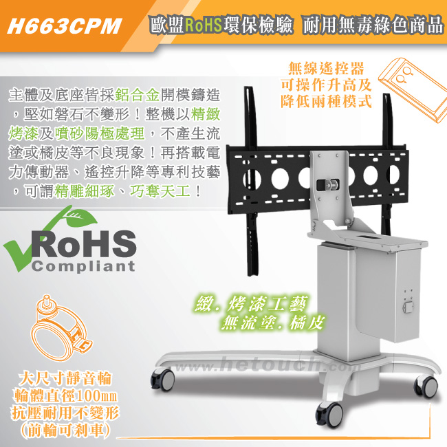 電動柱及底座皆採用鋁合金開模鑄造、一體成型,擁有外型流線、質地堅硬、主體防鏽、質量輕穎等優點;硬度、載重度與防鏽皆經過測試,本體絕對不會變形,保證桌車在正確的使用下能歷久彌新。