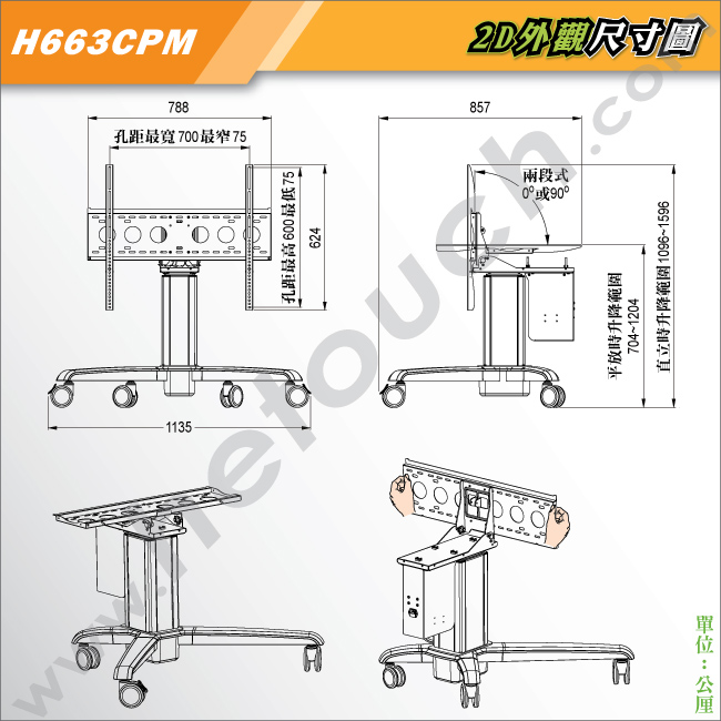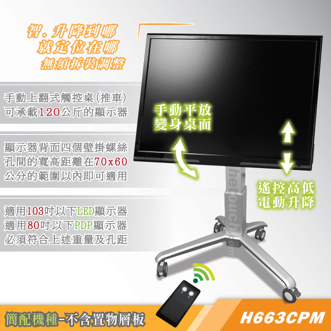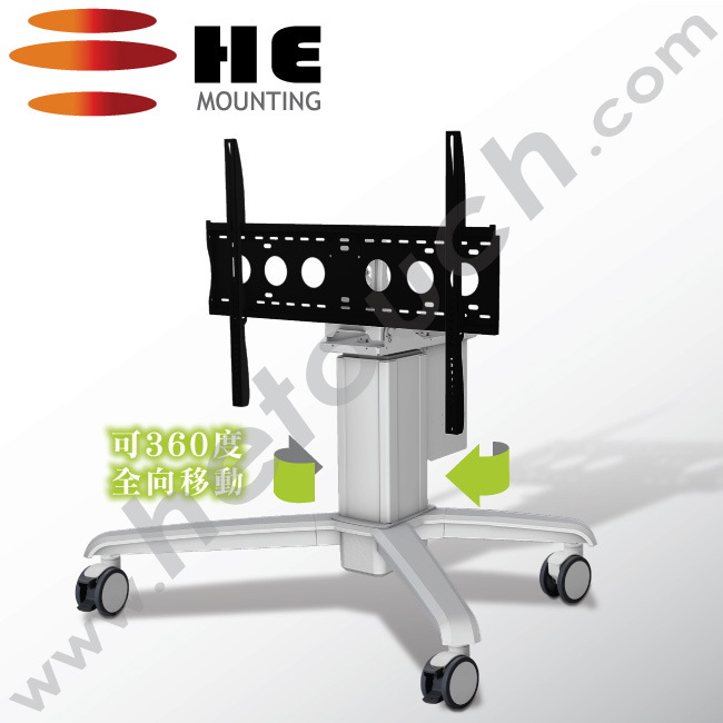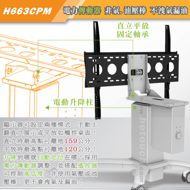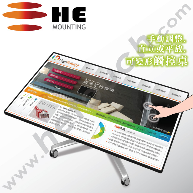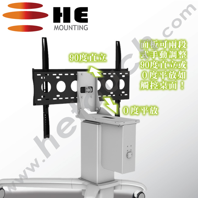 電動升降柱附有直立及平放的軸承,可手動上翻顯示器變形為90度直立或調整變形為0度平放兩種模式,讓使用者可依據不同的操作及展示方式,隨心所欲將桌車變形為觸控桌或觸控推車。