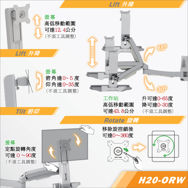 升降採用專利創新雙扭力桿(旋臂+柱體)搭載智慧型調節閥,可依據工作站及顯示器重量來調節扭力大小,載重轉緊、載輕放鬆(僅須調節一次 / 隨附調節器),用以控制升降的流暢度,優點為工作站及顯示器在高低升降時,不須任何工具或螺絲,升降到哪就自動定位在哪,讓平台及視角穩如泰山、不會疲乏下垂。