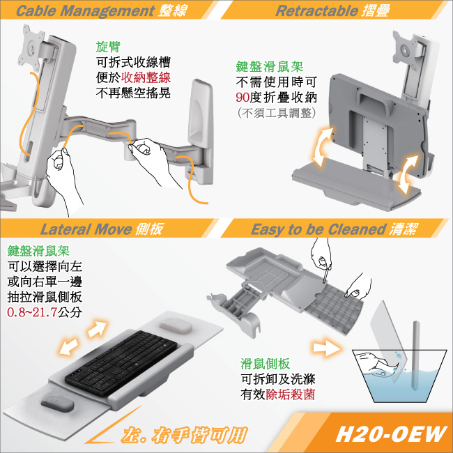 旋臂兩側附可拆式收線槽可收納各類線路、並使線路順著旋臂直達牆座的集線槽,不再懸空晃動、破壞整體美感。