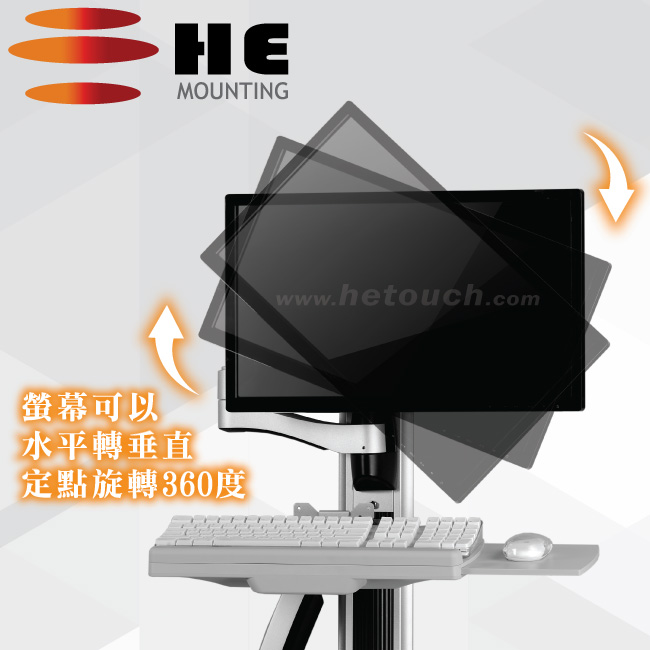 此工作站可全方位多角度移動,顯示器及鍵盤滑鼠架更可獨立高低升降,藉以調整至舒適的操作位置;旋臂並附有調節閥及調節軸承,可依據不同的顯示器或週邊設備重量來調整高低升降、上下俯仰、前後拉伸、左右轉向及移動時的流暢度,完全實現人體工學以人為尊的概念。