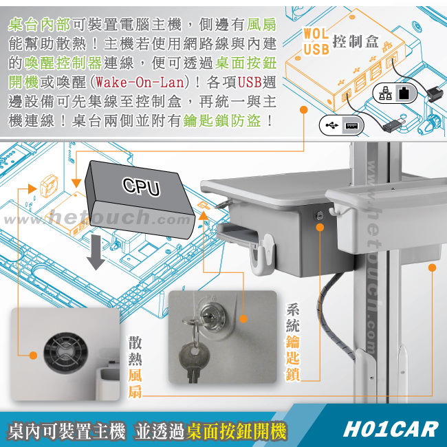 電腦主機若使用網路線與內建的喚醒控制器連線,並在主機的BIOS完成設定,便可透過桌面按鈕開機或喚醒系統(Wake-On-Lan),而不必將桌面拆下才能啟動桌台內部的主機。