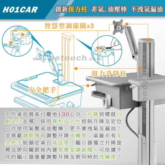 專利扭力柱搭載智慧型調節閥,可依據桌台的總載重量來調節扭力大小,載重轉緊、載輕放鬆(僅須調節一次),用以控制升降的流暢度,優點為桌台在高低升降時,不須任何工具或螺絲,僅需向上扳壓桌緣的安全把手即可調整高低度,範圍達50公分,升降到哪就自動定位在哪,隨調整即定位;鬆開安全把手後即能鎖定桌台高低,讓桌台穩如泰山、不會疲乏下垂。