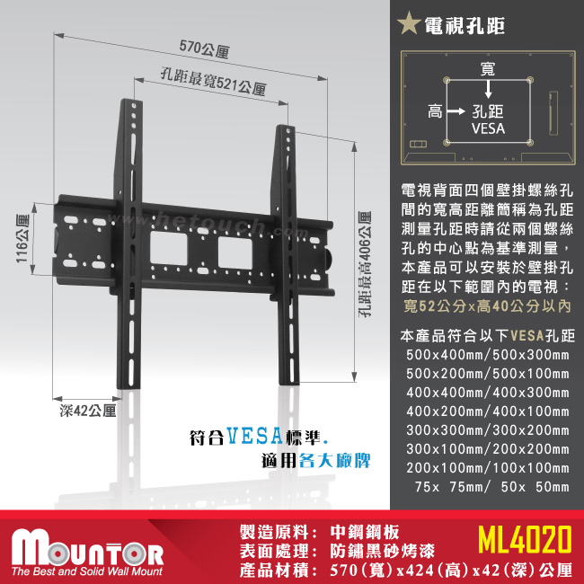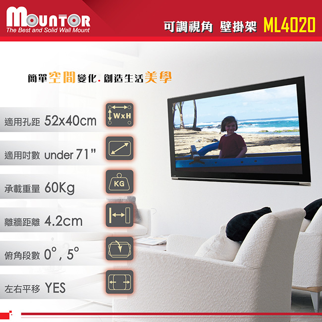 ◤通過SGS檢驗-ML4020通過第三方認證單位(SGS)的抗壓測試,支架的承載重力可達60公斤,牆板更可承載達4倍以上的重量,讓您的電視穩固於牆面,歷久不"摔"。