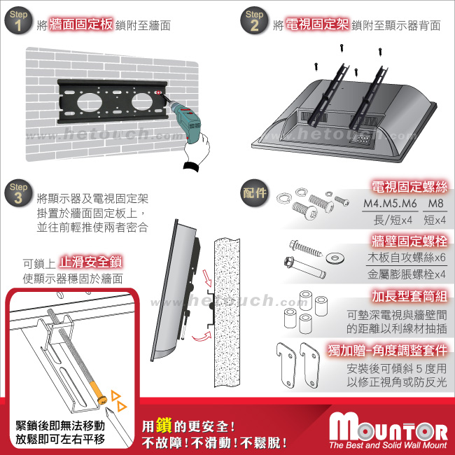 ◤止滑安全鎖-電視左右定位後,請緊鎖止滑安全鎖,可將電視穩穩地固定在背板上。