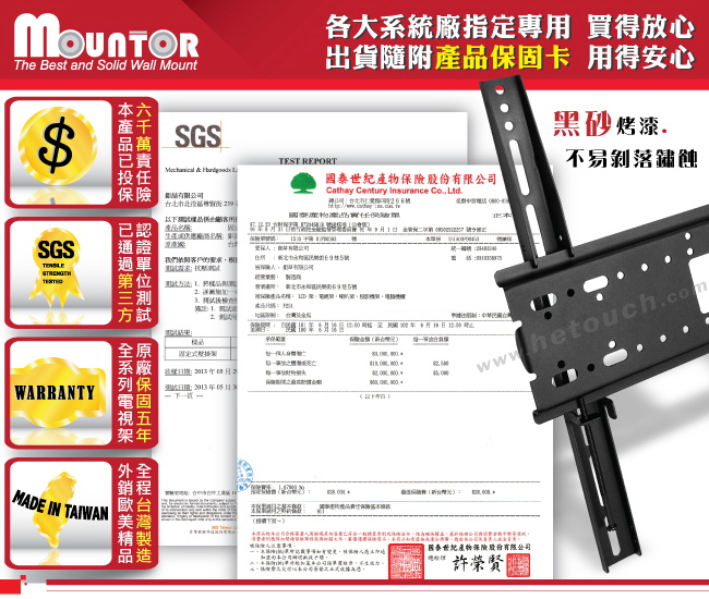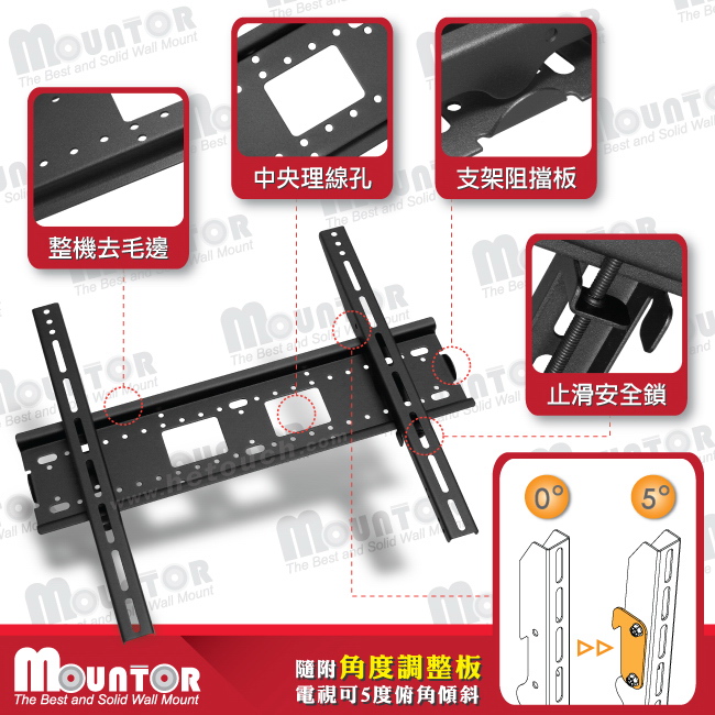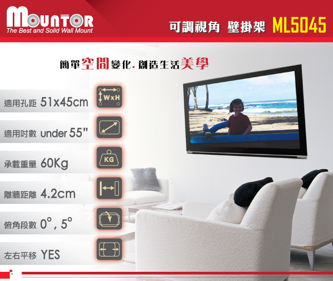 60公斤,牆板更可承載達四倍以上的重量,讓您的電視穩固於牆面,歷久不”摔”。