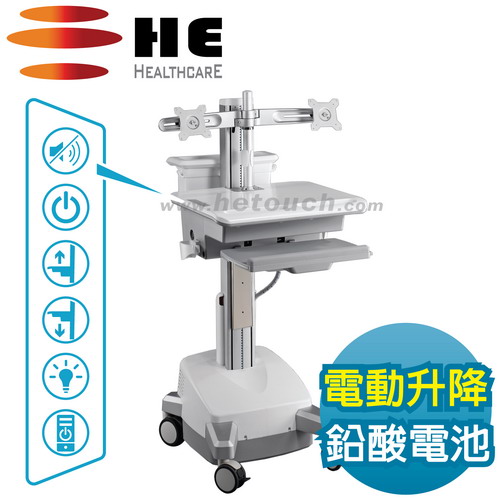 ●適用2台24吋以下VESA孔位的顯示器 ●桌內可裝置42x32x9公分以內電腦主機 ●不斷電任移動-內建2顆33Ah鉛酸蓄電池 ●電能驅動桌台-升降到哪就自動定位在哪 ●桌面按扭操控-供電/升降/照明/喚醒主機 ●桌面覆抗菌漆- SGS測試抗菌率99%以上 ●醫療電器安規-經TUV獲UL60601-1認證 ●歐盟RoHS檢驗-鋁合金綠化無毒護理車 ●台灣生產製造-桌台總載重可達15公斤 ●保固電子件1年機構件3年/投保6000萬