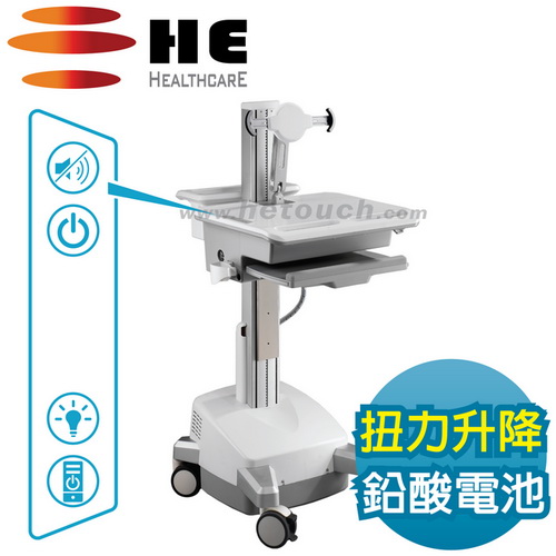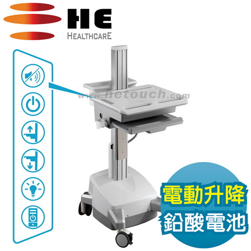 ●適用24吋以下支援VESA孔位的顯示器 ●桌內可裝置42x32x9公分以內電腦主機 ●不斷電任移動-內建2顆33Ah鉛酸蓄電池 ●電能驅動桌台-升降到哪就自動定位在哪 ●桌面按扭操控-供電/升降/照明/喚醒主機 ●桌面覆抗菌漆- SGS測試抗菌率99%以上 ●醫療電器安規-經TUV獲UL60601-1認證 ●歐盟RoHS檢驗-鋁合金綠化無毒護理車 ●台灣生產製造-桌台總載重可達15公斤 ●保固電子件1年機構件3年/投保6000萬