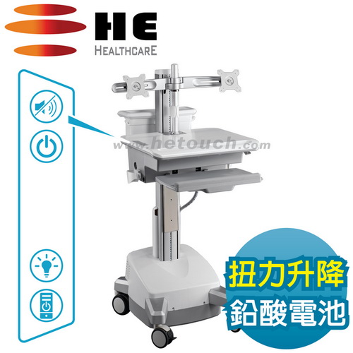 ●適用2台24吋以下VESA孔位的顯示器 ●桌內可裝置42x32x9公分以內電腦主機 ●不斷電任移動-內建2顆33Ah鉛酸蓄電池 ●智慧型扭力柱-升降到哪就自動定位在哪 ●桌面按扭操控-供電/鍵盤照明/喚醒主機 ●桌面覆抗菌漆- SGS測試抗菌率99%以上 ●醫療電器安規-經TUV獲UL60601-1認證 ●歐盟RoHS檢驗-鋁合金綠化無毒護理車 ●台灣生產製造-桌台總載重可達15公斤 ●保固電子件1年機構件3年/投保6000萬